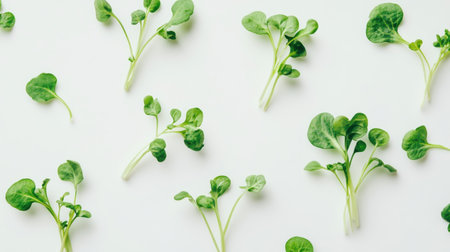 A collection of fresh green sprouts and leaves arranged on a white background, symbolizing health, nutrition, and vibrant living, perfect for culinary use.