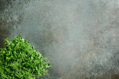 Cress salad Fresh raw in wooden olive bowl on a light stone background. Selective focus. Top view. Place for text