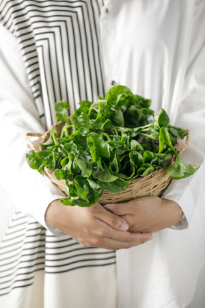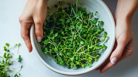 Hands holding a ceramic bowl with microgreens on a white background. Healthy eating, sustainable lifestyle.