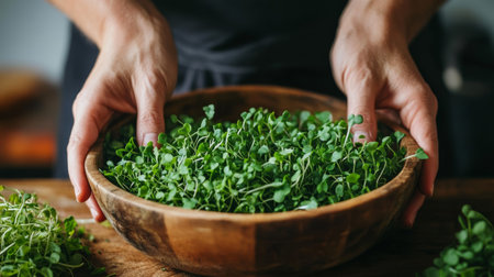 Hands holding a bowl with microgreens. Sustainable living, homegrown food.