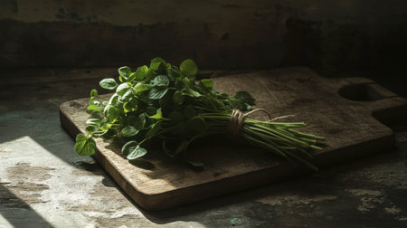 A vibrant bunch of fresh green herbs rests on a rustic wooden cutting board. Natural light enhances the textures, bringing warmth to the scene. Perfect for culinary themes.