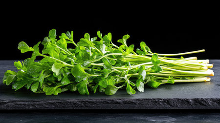 Raw watercress bunches freshly picked, styled on black surface to emphasize texture and color
