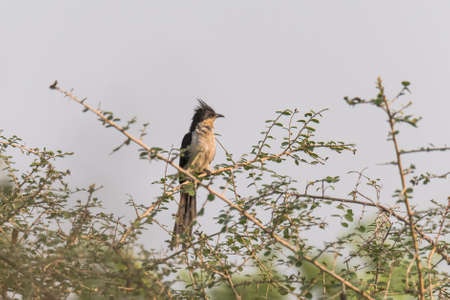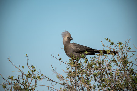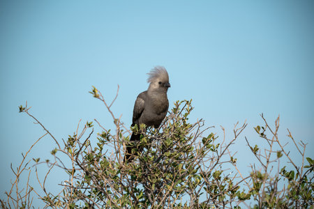 The gray go-away-bird (Crinifer concolor), also known as gray lourie, sitting on the dry bush. Morning sun. Green and blue sky in the background.