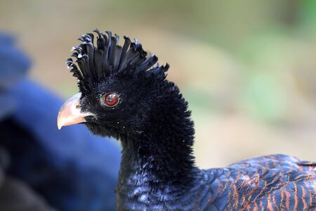 Horned Guan, Oreophasis derbianus, rare bird from Maxico and Guatemala. Big blaxk bird with red crest. Guan in green vegetation, nature habitat. Birdwatching in Central America. Detail portrait guan.