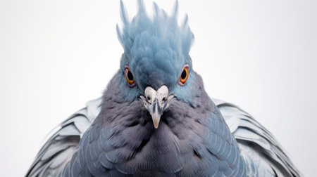 a large blue dove, reminiscent of gabriel metsu's humorous animal scenes, is captured in a contemporary realist portrait style. the close-up intensity and tightly cropped composition highlight the bird's vibrant colors against a clean white background. the overexposure adds a touch of artistic flair to this captivating image. ai generated