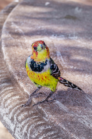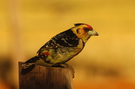 Bearded cabecirrojo, Red-and-yellow barbet perched on a log