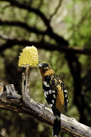A blacked headed grosbeak having a snack on an ear of corn