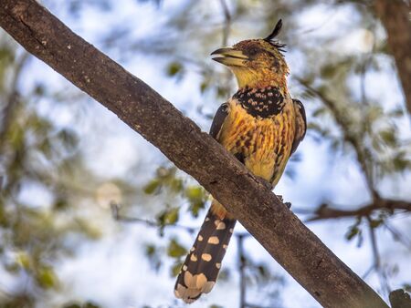 Crested barbet (Trachyphonus vaillantii) bird perched in tree on Satara Camp in Kruger national park South Africa