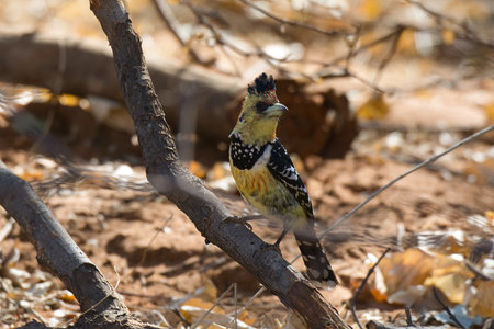 Crested barbet (Trachyphonus vaillantii) feeding during the day, Kruger National Park, South Africa
