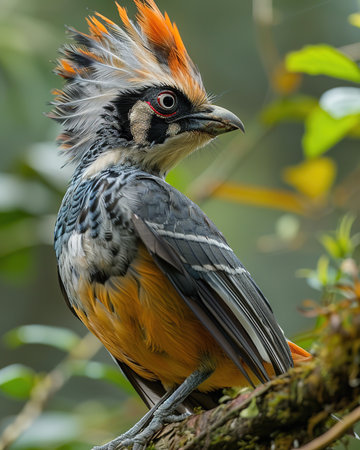 A vibrant bird with striking colors rests on a branch surrounded by lush greenery. Its bright features stand out in the natural setting.