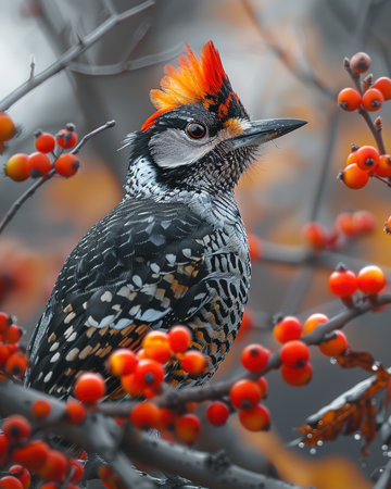 A striking woodpecker with a bright red crest and intricate black and yellow plumage rests on the rough bark of a tree. The birds sharp beak and intense gaze suggest alertness as it surveys its surroundings. Sunlight filters through the leaves casting a warm glow on the creature highlighting its unique markings