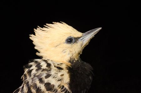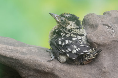 A young crested barbet (Trachyphonus vaillantii) peeking from nesting hole in a tree, South Africa