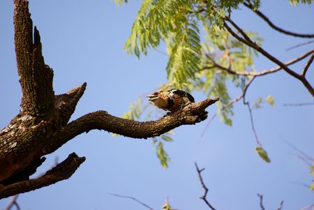 Brown Headed Barbet resting on a tree on a sunny day