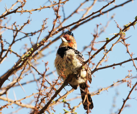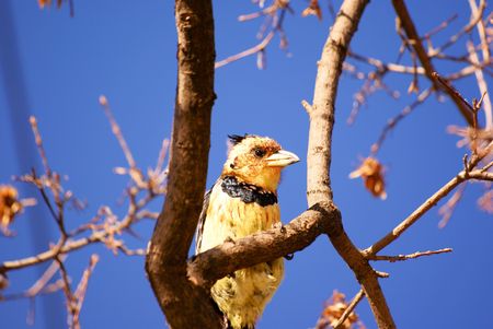 A crested barbet sitting in a tree, South Africa