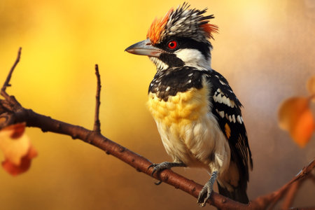 Colorful red-and-yellow barbet (trachyphonus erythrocephalus) sitting on a branch, copy space for text