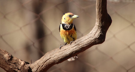 Red and Yellow Barbet sitting on branch in park