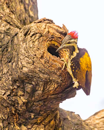 A Lesser Flameback woodpecker at its nest on a tree trunk