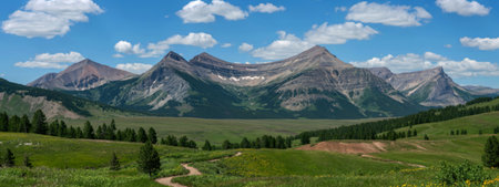 Panoramic view of alpine meadow with wildflowers and mountains in background