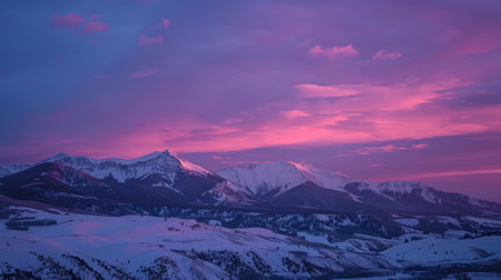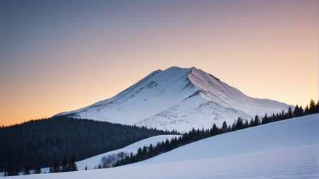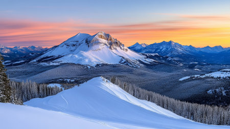 Breathtaking snowy mountain landscape at sunrise with colorful skies and serene forest views.