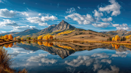 A picturesque landscape features a mountain range mirrored in the still waters of a lake. Golden foliage and a vibrant blue sky add contrast. The composition is balanced and serene, offering potential for use in travel, nature, or environmental themed projects, suitable for both commercial and editorial contexts.