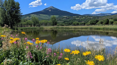 A picturesque scene featuring vibrant wildflowers in the foreground and a serene pond reflecting the majestic mountain landscape under a clear blue sky.