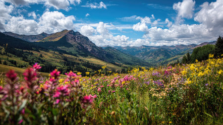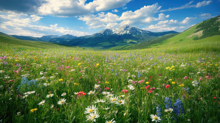 A vibrant wildflower meadow fills the foreground with colorful blooms, while majestic mountains rise majestically under a clear blue sky adorned with fluffy clouds.