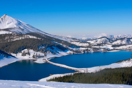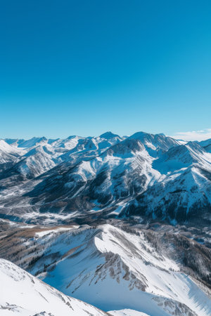 Majestic snowy peaks towering over a frosted valley with clear blue skies in the background
