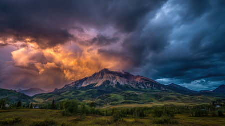 Dark clouds gather over a majestic mountain range as the sun sets casting vibrant colors across the sky. The serene valley below contrasts with the intense sky.
