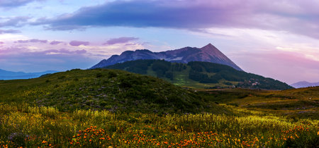 Panoramic view of colorful wildflower meadows around Crested butte with cloudy evening sky