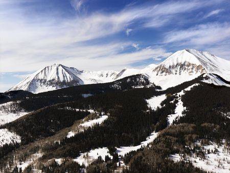 Mountain peaks with trees and snow covered tops. Horizontal shot.