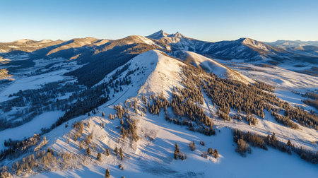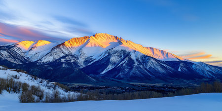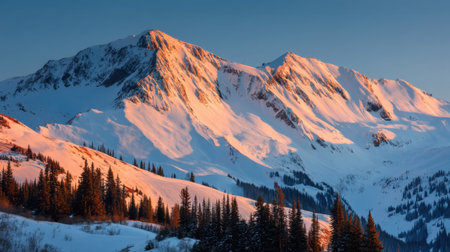 Discover a breathtaking winter landscape featuring majestic snow-capped mountain peaks bathed in golden morning light. Ideal for nature lovers.