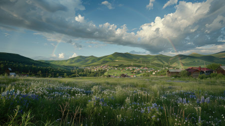 a beautiful rainbow spanning over lush green mountains with purple flowers in full bloom during springtime, against a backdrop of a post-rain landscape with cloudy skies
