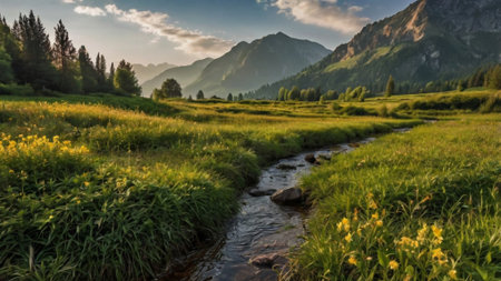 A stunning view of a vibrant wildflower meadow with a gently flowing stream and majestic mountains in the background, perfect for nature lovers.
