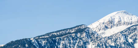 panorama of mountains with snow on top clear blue sky British Columbia Canada.