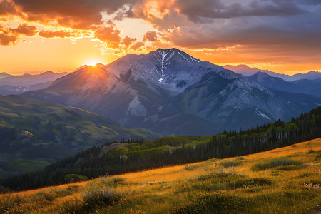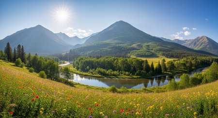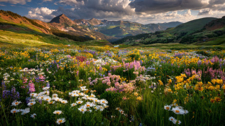 Colorful wildflowers flourish in a sun-drenched meadow, creating a peaceful atmosphere. Majestic mountains rise in the distance, illuminating the beauty of nature in full bloom.