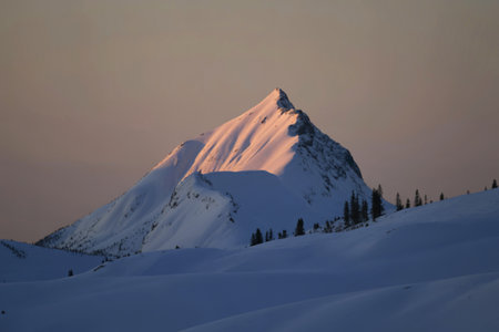 A tall mountain peak stands majestically, its summit bathed in warm sunlight during sunset. Snow covers the slopes, while a moody sky adds depth to the scene, creating a tranquil winter landscape.