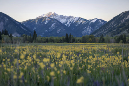 A picturesque view of a vibrant wildflower field set against a majestic mountain range, showcasing nature