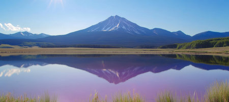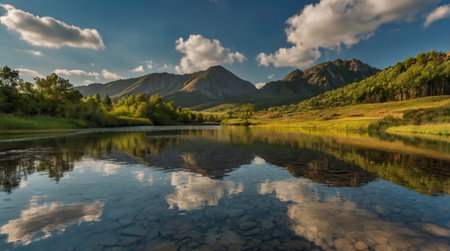 Stock showing a panoramic landscape of a serene alpine lake reflecting snow-capped mountains and lush green rolling hills bathed in the warm golden light of sunrise...
