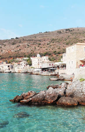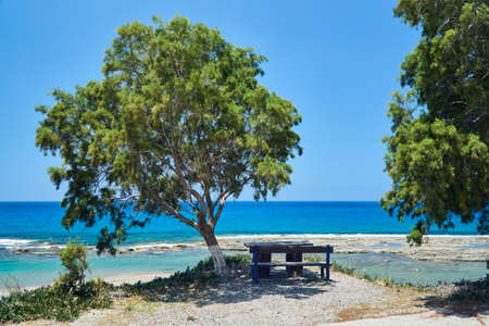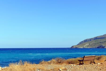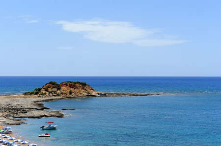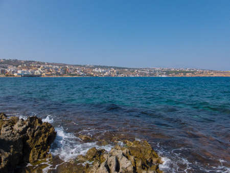 Rethymno, Greece - July 29, 2016: Rocky mediterranean beach. The Sea of Crete is the sea south of the Aegean Sea, north of the island Crete, and south of the Cyclades.