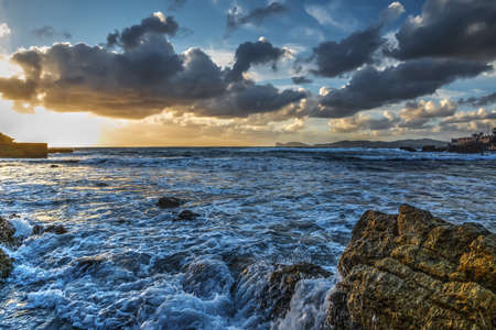 Dramatic sky over Alghero coastline at sunset, Sardinia
