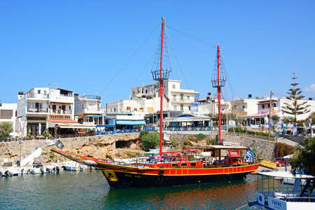 Black Rose Pirate ship moored in the harbour with waterfront restaurants to the rear, Sissi, Crete, Europe.