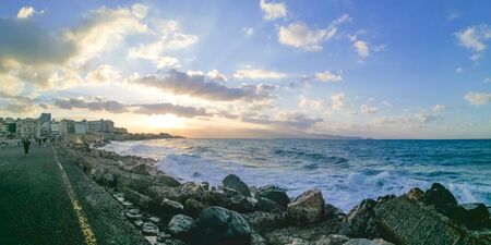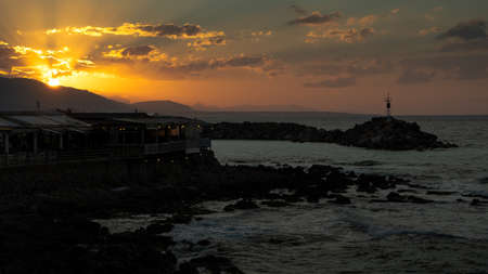 Beautiful sunset at Heraklion harbor. Crete Greece. Cloudy sunset and waves.