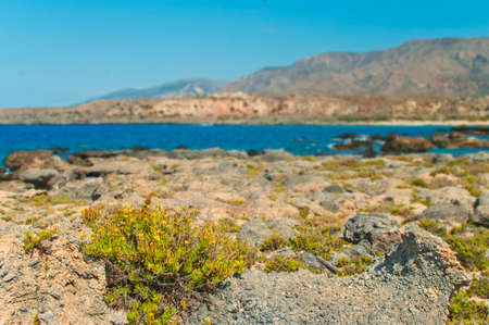 small yellow flowers growing on rocks with sea and mountains at background, Elafonisi beach, Crete, Greece
