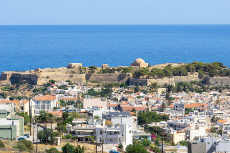 Rethymno, Greece - July 30, 2016: Panoramic view to Rethymno from Fortezza castle. Rethymno is a city of approximately 40,000 people in Greece, the capital of Rethymno regional unit on the island of Crete. The old town of Rethymnon is one of the best-pre
