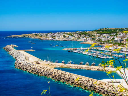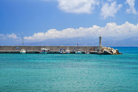 Chersonissos, Greece - June 24, 2015: Vew of port with lighthouse and emerald water.