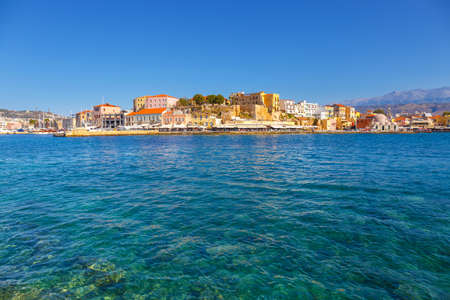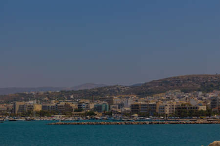 Rethymno, Greece - July 30, 2016: Panoramic view to Rethymno from the Venetian harbour. Rethymno is a city of approximately 40,000 people in Greece, the capital of Rethymno regional unit on the island of Crete.