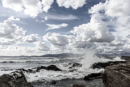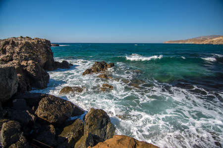 The rocky wild coast of the Aegean Sea is a convenient place for fishing in Crete