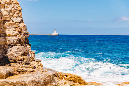 Ancient stone military fort Malta island made of brick rocks on shore blue sea with view city Valetta