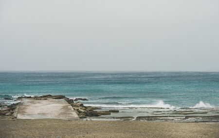 Empty sandy coast and pier at Mediterranean sea in winter day after storm in Alanya, Turkey