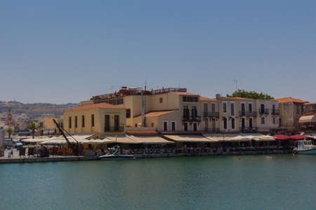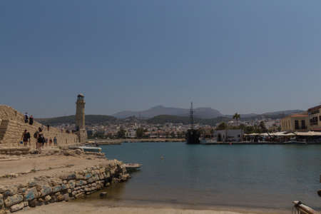Rethymno, Greece - July 30, 2016: Venetian harbour. The Venetian Harbor of Rethymnon, next to the modern harbor of the city, with the Egyptian lighthouse is one of the most picturesque areas of the old town. It operated in the Byzantine period (after 961
